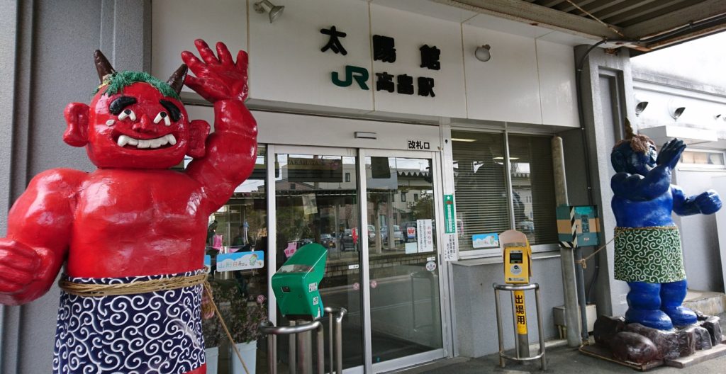 マハちゃんが4歳のときに山形の赤湯温泉に旅行したとき、高畠駅に赤鬼と青鬼がいたね!