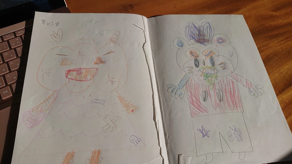 これはきっと小学1年生くらいの時にママと一緒に男(の子)と女(の子)でどっちが怖くなるか描き比べたような…左が女(の子)で右が男(の子)。どっちも怖い(笑)